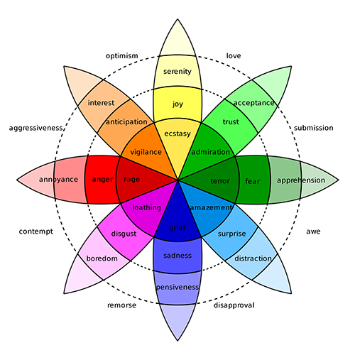 En Goethe had gelijk! Uit verschillende wetenschappelijke onderzoeken is gebleken dat kleuren onze psychologische en zelfs ook fysieke staat beïnvloeden. Studies hebben aangetoond dat de kleur rood zorgt voor een verhoging van de bloeddruk en hartslag. Onze reactie op kleur varieert afhankelijk van cultuur en context. Er bestaan vele verschillende theorieën (bijvoorbeeld de afbeelding links) over welke kleur waar voor staat of welke emotie deze zou oproepen. Hierbij kan elke kleur vaak voor meerdere dingen staan. Een door Hollywood veel gebruikt voorbeeld is het Wheel of Emotions, van wetenschapper Robert Plutchik (midden). Een mooi voorbeeld van verschillende emoties en kenmerken van een bepaalde kleur in hedendaagse cinema (rechts):